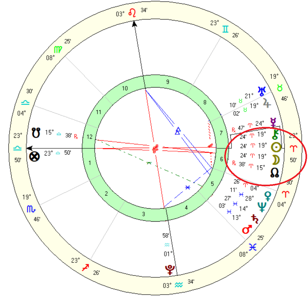 Solförmörkelsen är nymåne då solen och månen sammanfaller men de är även i konjunktion med någon av månnoderna. I det fallet är de alla i Väduren, tillsammans med Kiron (du ser den i kartan precis ovan solen – grön och nyckel liknande).